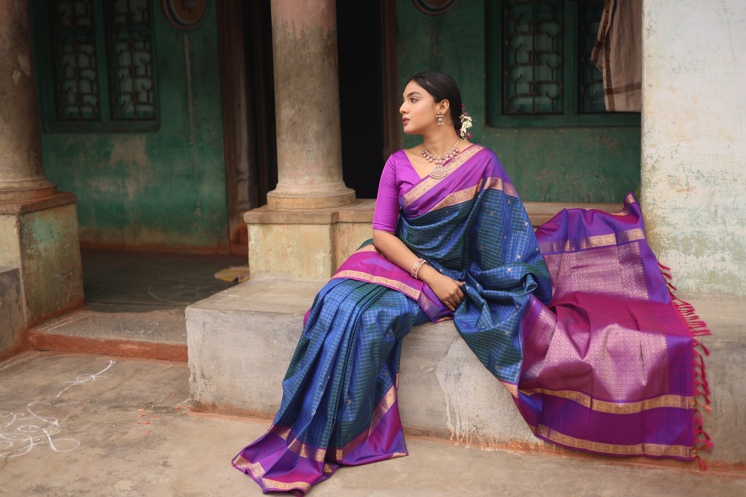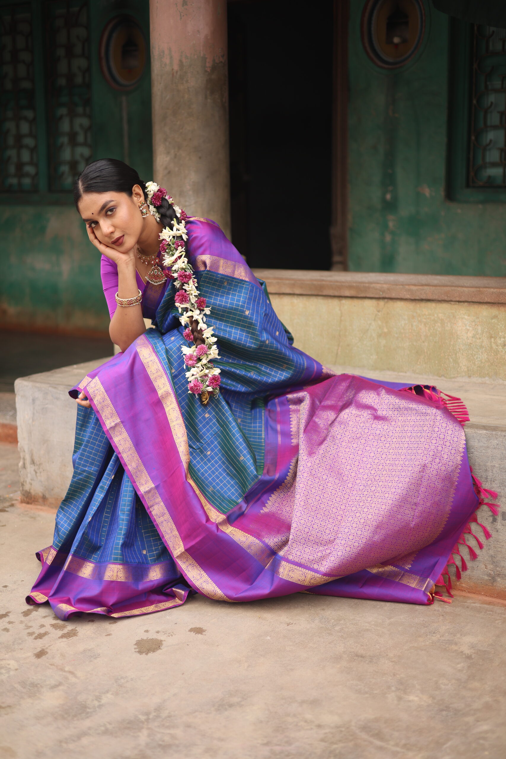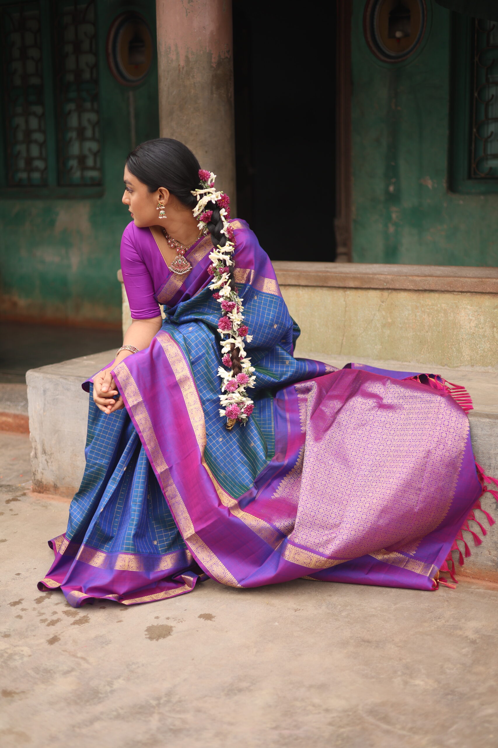 Inaya radiates a deep and regal charm through its classic and structured design. This pure handloom silk saree features a stunning MS Blue body detailed with a traditional body check pattern. We have paired the rich blue silk with a striking purple contrast Retta Pattu border that provides a regal frame. This double-row border features intricate traditional motifs woven in premium 1g gold zari. The highlight remains the beautiful, hand-woven zari pallu that showcases dense and sophisticated craftsmanship. This combination of heritage checks and a double-zari border makes it an ideal choice for grand festive celebrations.