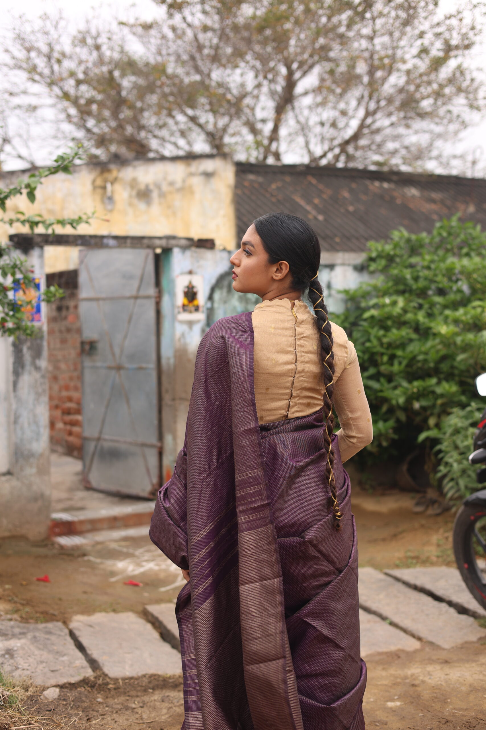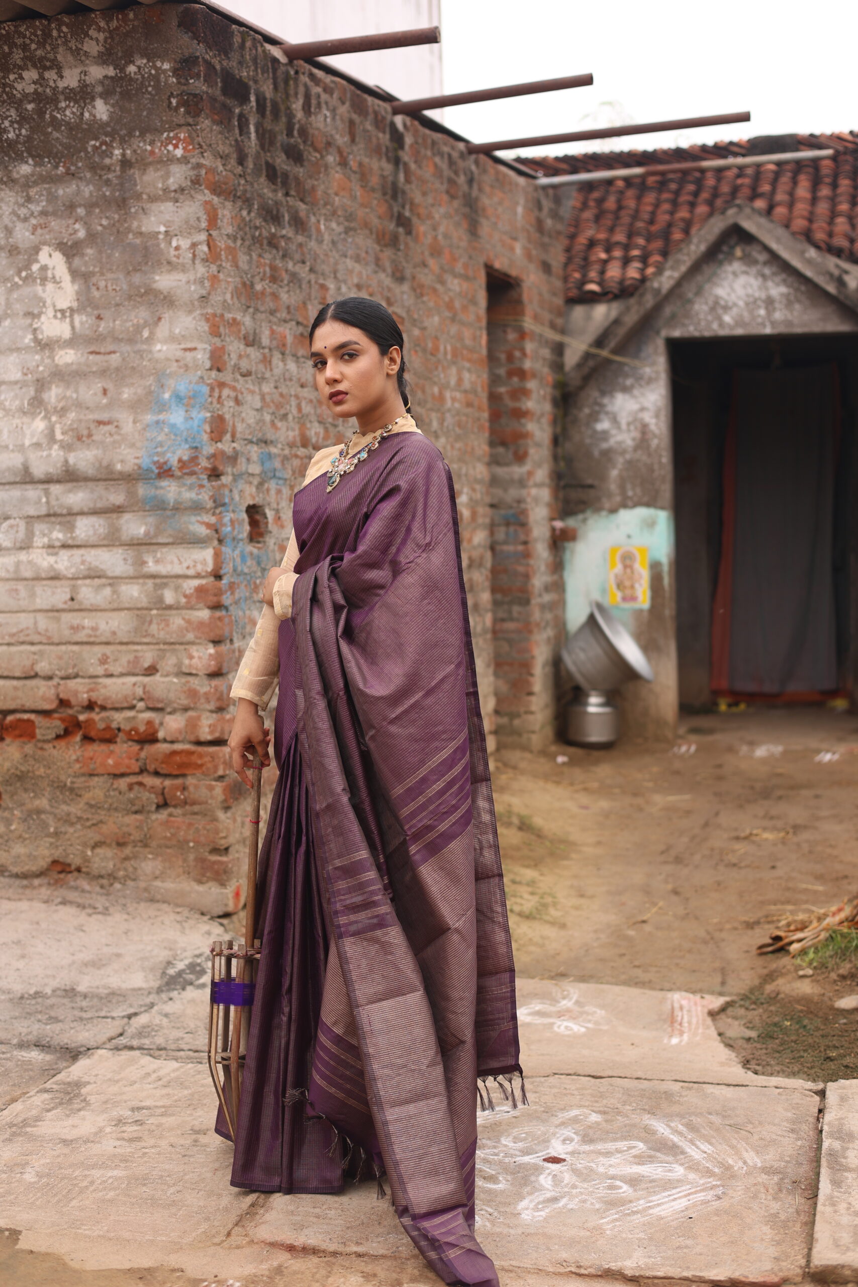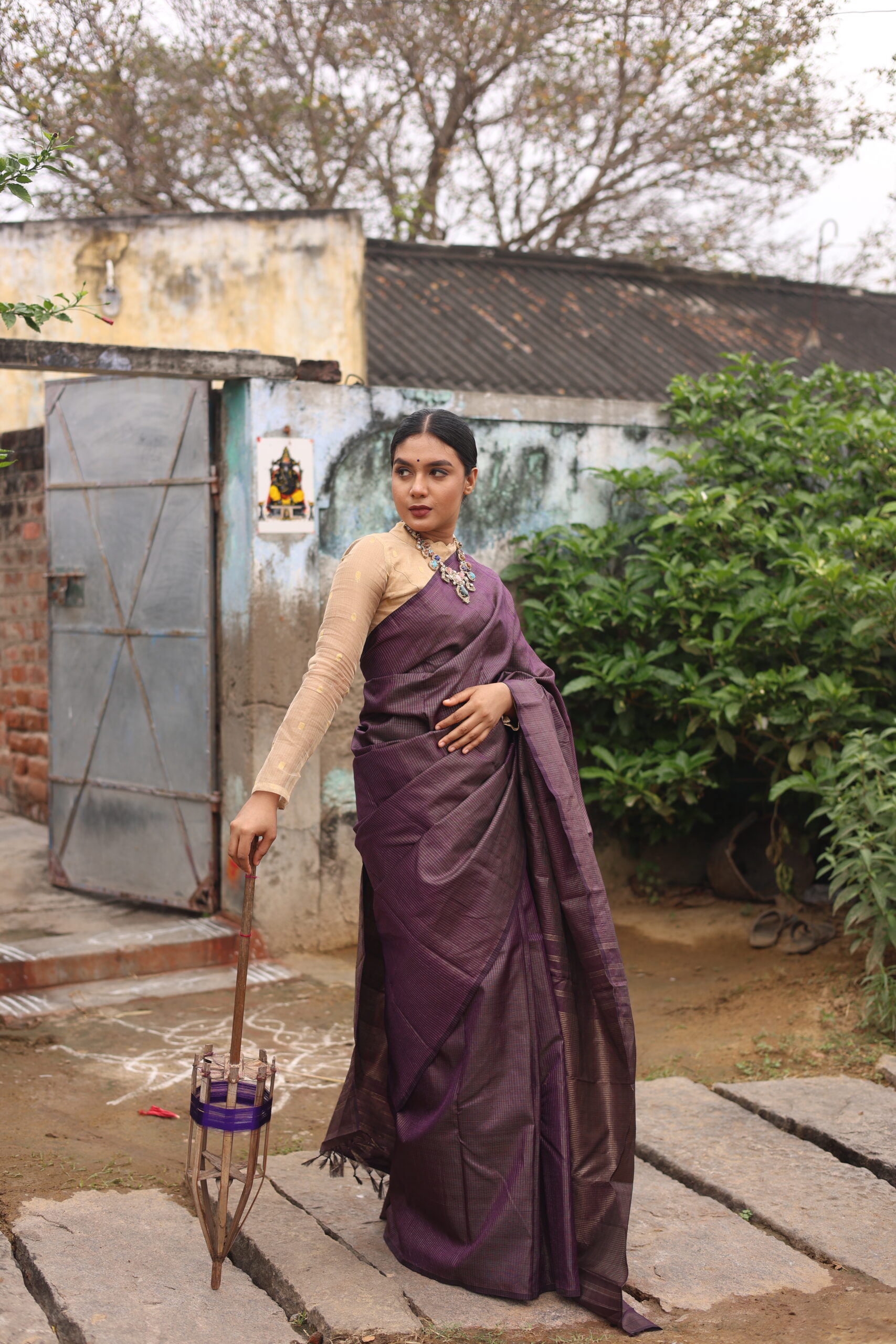 Yamini captures the quiet magic of a moonlit night. This saree features a deep, soulful purple body woven with podi kattam (tiny micro-checks). These subtle zari checks create a delicate shimmer that catches the light beautifully. The design stays clean and sophisticated. Thin gold zari stripes accent the border and the pallu for a modern touch. We chose this lightweight handloom silk for its fluid drape and breathable feel.