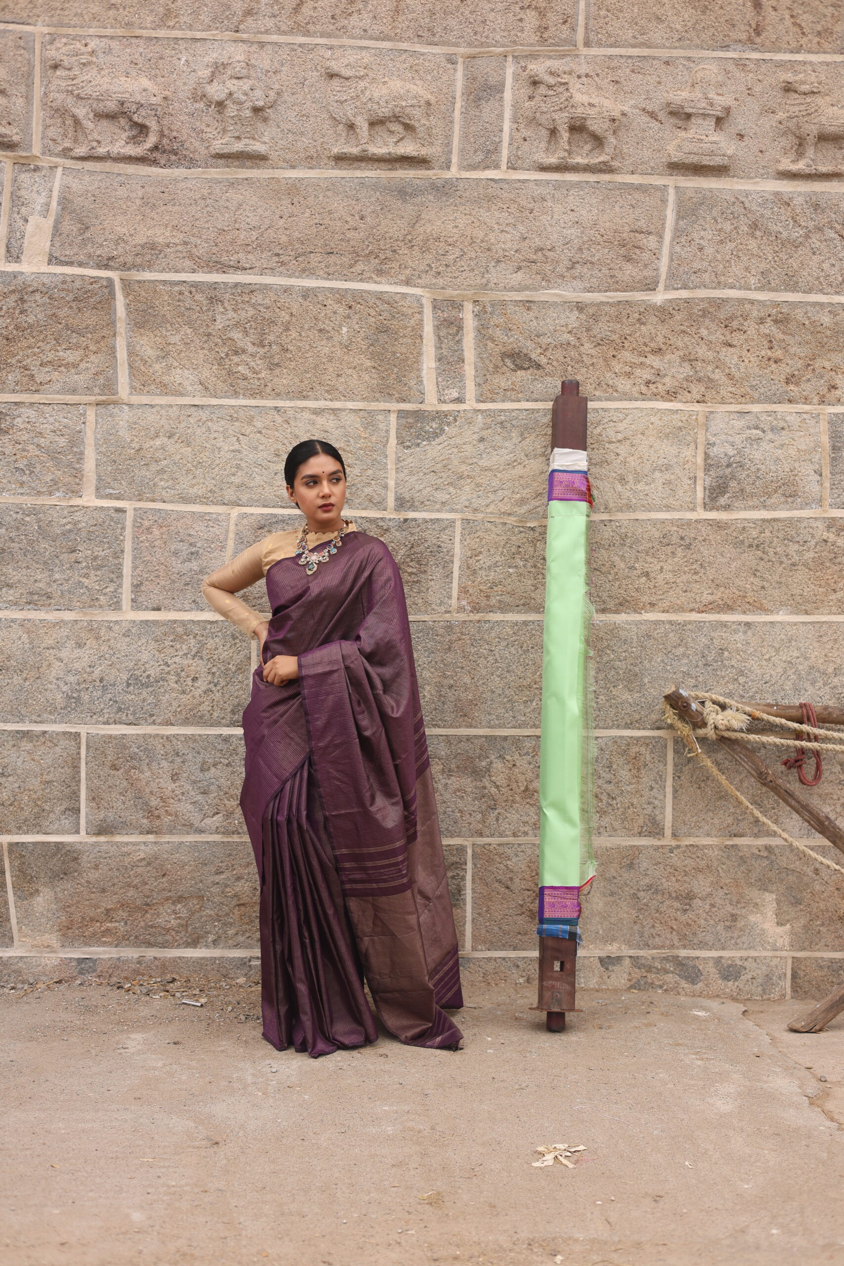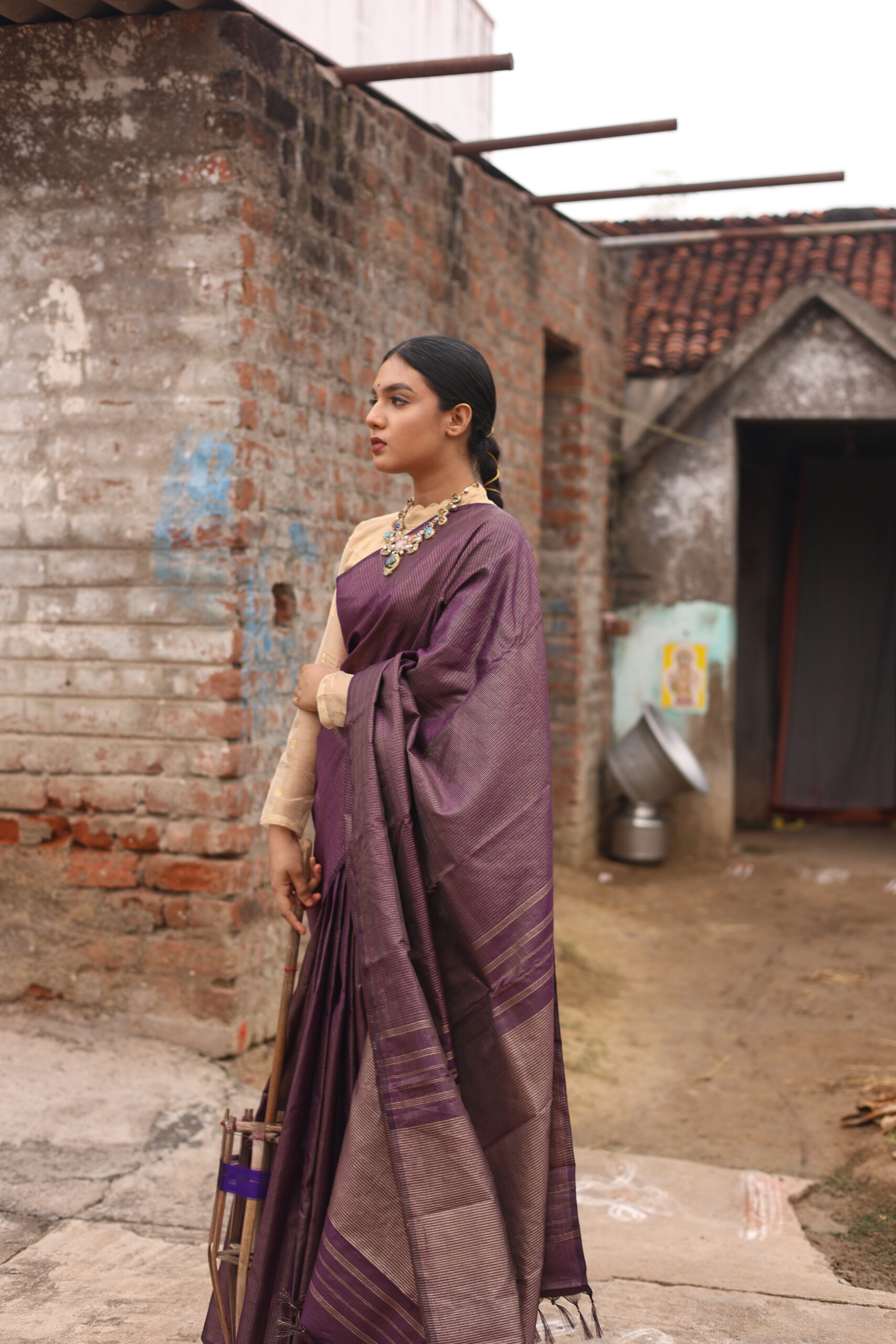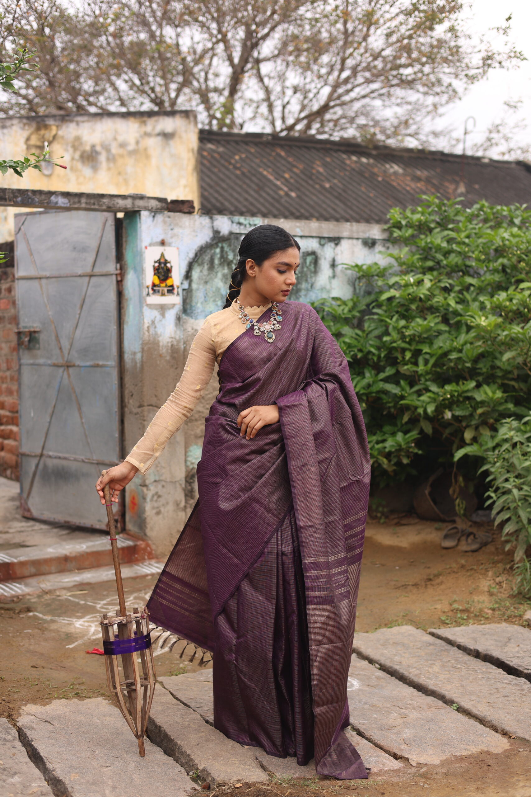 Yamini captures the quiet magic of a moonlit night. This saree features a deep, soulful purple body woven with podi kattam (tiny micro-checks). These subtle zari checks create a delicate shimmer that catches the light beautifully. The design stays clean and sophisticated. Thin gold zari stripes accent the border and the pallu for a modern touch. We chose this lightweight handloom silk for its fluid drape and breathable feel.